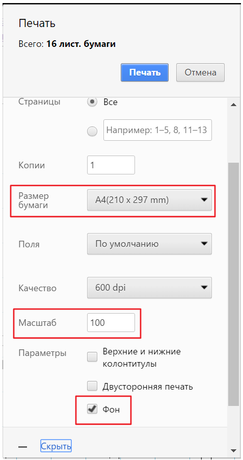 Нажмите кнопку "Печать".